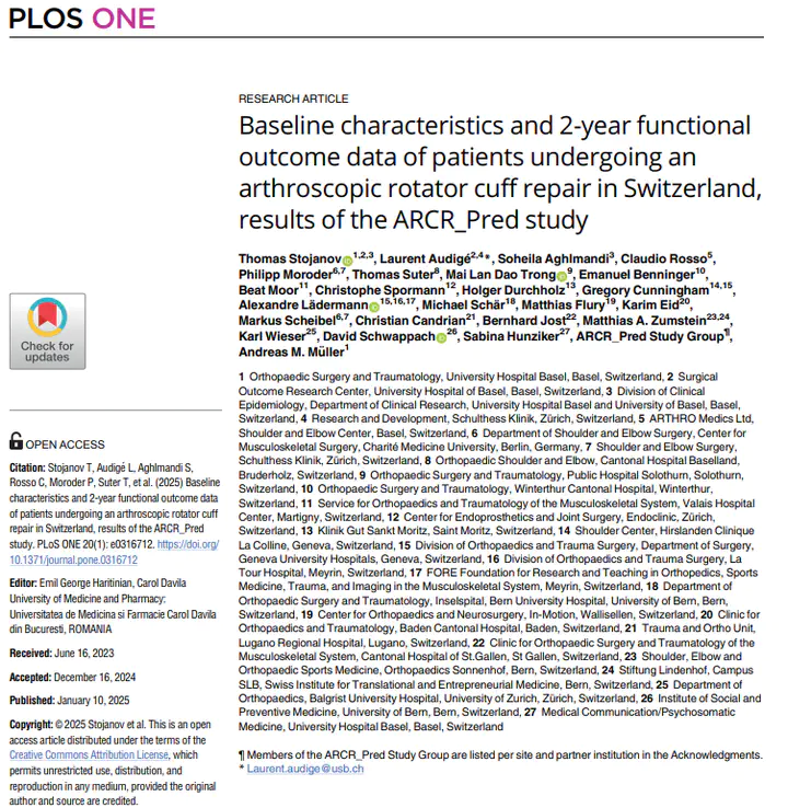 The ARCR_Pred study was initiated to document and predict the safety and effectiveness of arthroscopic rotator cuff repair (ARCR) in a representative Swiss patient cohort. In the present manuscript, we aimed to describe the overall and baseline characteristics of the study, report on functional outcome data and explore case-mix adjustment and differences between public and private hospitals. Between June 2020 and November 2021, primary ARCR patients were prospectively enrolled in a multicenter cohort across 18 Swiss and one German orthopedic center. Baseline characteristics, including sociodemographic and diagnostic variables, were reported. Clinical scores and patient-reported outcome measures were assessed up to 24-month follow-up. After screening 2350 individuals, 973 patients with ARCR were included. Follow-up rates reached 99%, 95%, 89% and 88% at 6 weeks, 6, 12, and 24 months, respectively. While the proportion of massive tears was higher in the study population (44% vs. 20%, Std. Diff. = 0.56), there were no other major differences in key characteristics between enrolled and non-enrolled patients or in patients lost to follow-up. Functional scores improved over time, with positive changes rates ranging from 83% to 92% at 6-month, reaching 91% to 97% at 12- and 24-month follow-up. In linear mixed models, used to estimate the associations between baseline factors, hospital type and standardized 0–100 scores, marginal effects for time ranged from 20 to 30, 28 to 39 and 34 to 41 points at the 6-, 12- and 24-month follow-up, respectively. Except at the 12-month follow-up, where marginal effects for the interaction terms ranged from -5 to -4 points in the standardized scores, there were no consistent outcome differences between public and private hospitals. Increasing number of years of education was consistently associated with better scores, greater feelings of depression and anxiety, smoking and ASA group III-IV were consistently associated with worse scores. Tear severity showed a consistent negative association solely for the Constant-Score. The ARCR_Pred study shows high potential for generalizability to the population of patients undergoing an ARCR in Switzerland. Further analyses are needed to establish relevant clinimetrics for the Swiss population and to compare outcomes for surgical techniques, surgeon experiences profiles and post-operative management.