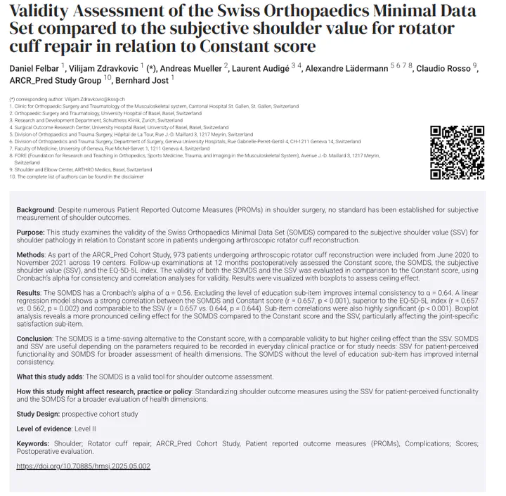 Background: Despite numerous Patient Reported Outcome Measures (PROMs) in shoulder surgery, no standard has been established for subjective measurement of shoulder outcomes. Purpose: This study examines the validity of the Swiss Orthopaedics Minimal Data Set (SOMDS) compared to the subjective shoulder value (SSV) for shoulder pathology in relation to Constant score in patients undergoing arthroscopic rotator cuff reconstruction. Methods: As part of the ARCR_Pred Cohort Study, 973 patients undergoing arthroscopic rotator cuff reconstruction were included from June 2020 to November 2021 across 19 centers. Follow-up examinations at 12 months postoperatively assessed the Constant score, the SOMDS, the subjective shoulder value (SSV), and the EQ-5D-5L index. The validity of both the SOMDS and the SSV was evaluated in comparison to the Constant score, using Cronbach’s alpha for consistency and correlation analyses for validity. Results were visualized with boxplots to assess ceiling effect. Results: The SOMDS has a Cronbach’s alpha of α = 0.56. Excluding the level of education sub-item improves internal consistency to α = 0.64. A linear regression model shows a strong correlation between the SOMDS and Constant score (r = 0.657, p < 0.001), superior to the EQ-5D-5L index (r = 0.657 vs. 0.562, p = 0.002) and comparable to the SSV (r = 0.657 vs. 0.644, p = 0.644). Sub-item correlations were also highly significant (p < 0.001). Boxplot analysis reveals a more pronounced ceiling effect for the SOMDS compared to the Constant score and the SSV, particularly affecting the joint-specific satisfaction sub-item. Conclusion: The SOMDS is a time-saving alternative to the Constant score, with a comparable validity to but higher ceiling effect than the SSV. SOMDS and SSV are useful depending on the parameters required to be recorded in everyday clinical practice or for study needs: SSV for patient-perceived functionality and SOMDS for broader assessment of health dimensions. The SOMDS without the level of education sub-item has improved internal consistency. What this study adds: The SOMDS is a valid tool for shoulder outcome assessment. How this study might affect research, practice or policy: Standardizing shoulder outcome measures using the SSV for patient-perceived functionality and the SOMDS for a broader evaluation of health dimensions.