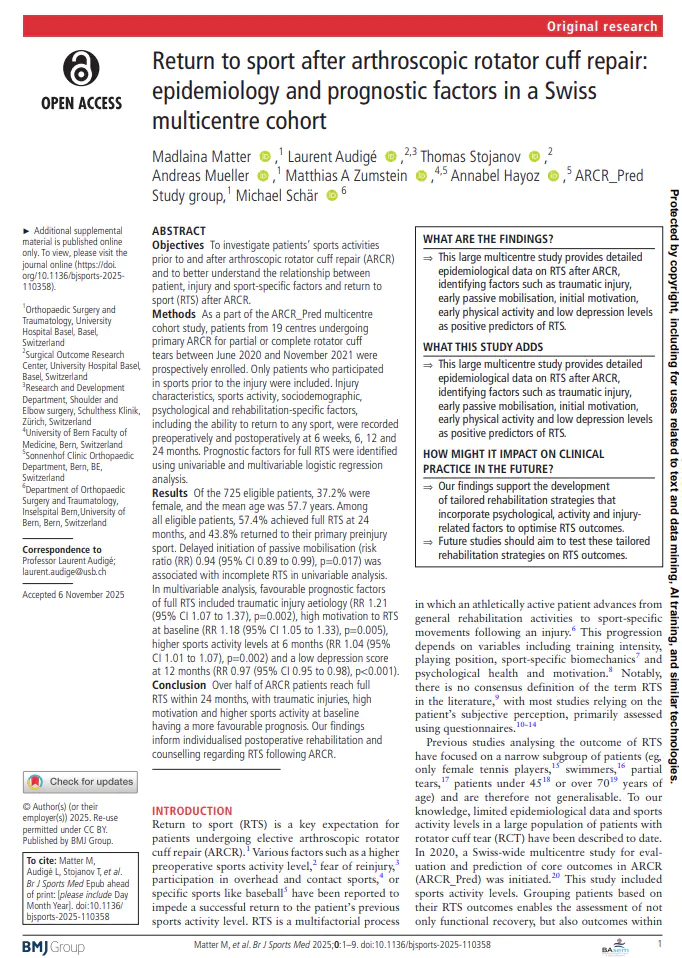 Objectives To investigate patients’ sports activities prior to and after arthroscopic rotator cuff repair (ARCR) and to better understand the relationship between patient, injury and sport-specific factors and return to sport (RTS) after ARCR. Methods As a part of the ARCR_Pred multicentre cohort study, patients from 19 centres undergoing primary ARCR for partial or complete rotator cuff tears between June 2020 and November 2021 were prospectively enrolled. Only patients who participated in sports prior to the injury were included. Injury characteristics, sports activity, sociodemographic, psychological and rehabilitation-specific factors, including the ability to return to any sport, were recorded preoperatively and postoperatively at 6 weeks, 6, 12 and 24 months. Prognostic factors for full RTS were identified using univariable and multivariable logistic regression analysis. Results Of the 725 eligible patients, 37.2% were female, and the mean age was 57.7 years. Among all eligible patients, 57.4% achieved full RTS at 24 months, and 43.8% returned to their primary preinjury sport. Delayed initiation of passive mobilisation (risk ratio (RR) 0.94 (95% CI 0.89 to 0.99), p=0.017) was associated with incomplete RTS in univariable analysis. In multivariable analysis, favourable prognostic factors of full RTS included traumatic injury aetiology (RR 1.21 (95% CI 1.07 to 1.37), p=0.002), high motivation to RTS at baseline (RR 1.18 (95% CI 1.05 to 1.33), p=0.005), higher sports activity levels at 6 months (RR 1.04 (95% CI 1.01 to 1.07), p=0.002) and a low depression score at 12 months (RR 0.97 (95% CI 0.95 to 0.98), p<0.001). Conclusion Over half of ARCR patients reach full RTS within 24 months, with traumatic injuries, high motivation and higher sports activity at baseline having a more favourable prognosis. Our findings inform individualised postoperative rehabilitation and counselling regarding RTS following ARCR.
